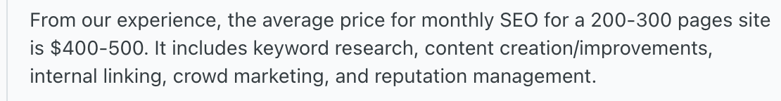 This redditor is saying $400 – $500 for a 200 – 300 page site. If my math is correct, that’s about 2 bucks a page. (It typically takes 1 – 2 hours to properly optimize one page by the way)