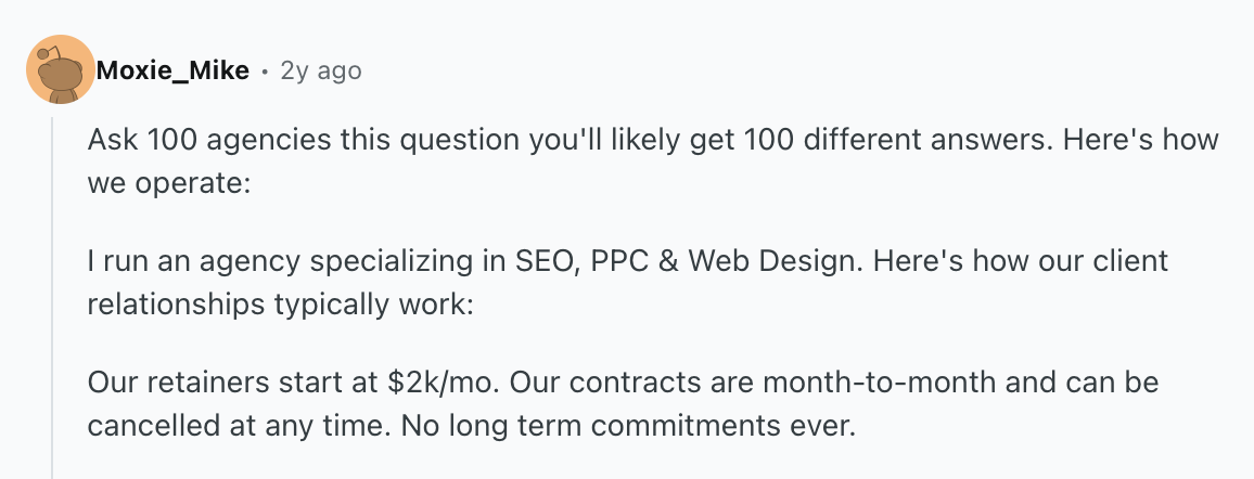 One Redditor mentioned their retainers start at $2,000/month—which is actually a solid price, depending on what’s included. But then they added that their services are strictly month-to-month with no long-term commitment.