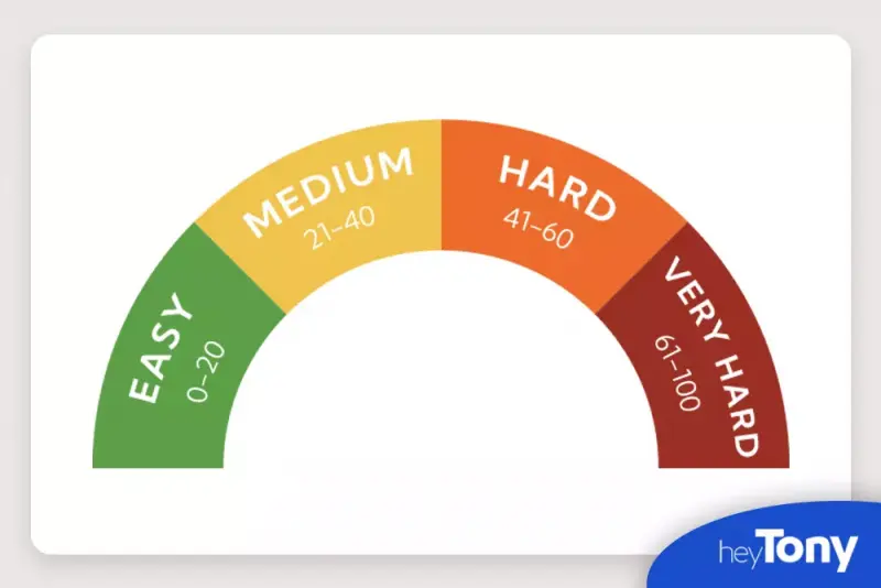 Keyword difficulty is almost always measured on a scale running from 1 to 100. The higher the number, the more difficult a keyword will be to rank for.